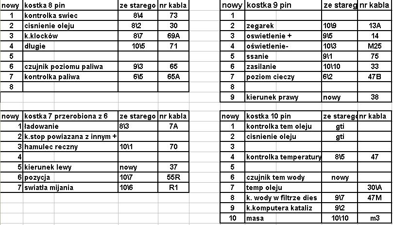 no to kolego cejot miałeś szczęście że według nr. kabli bo ja popodpinałem jak ostatni osiołek i po przekręceniu stacyjki poleciał dym i ścieżki popalone.. potem poleciałem do domu o pomoc was (forumowiczów) prosić i właśnie mi podesłał Grzesiek schematy, które zawierały tylko nowy rozkład kabli i ich numery.. podłączyłem, ścieżki połatałem i śmiga! wiem że moja wina bo ślepo zaufałem ze poprzekładam piny.. kontrolka od klocków jest złe ręczny się łączy w jeden pin z płynem i takie tam, a i jeszcze z masą jest zamotane wychodzi ze plus birzesz ze starej 10/10 i mase też ze starej 10/10. tego schematu od Grześka nie mam bo mi się zapodział gdzieś na dysku, ale mam w wozie na kartce wrzuce go tu bo się przyda!!!