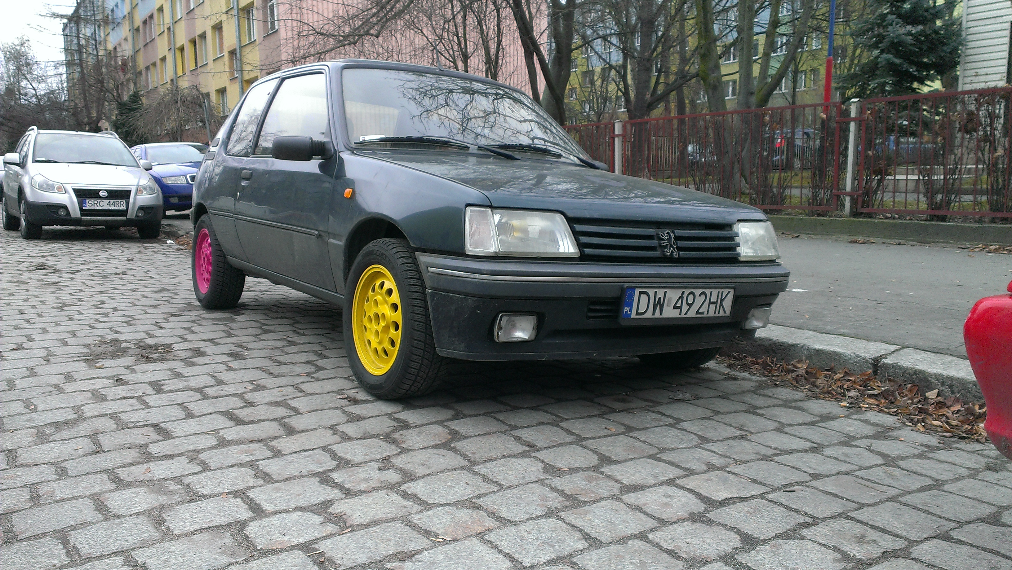 W sumie założyłem je dopiero przed świętami. Mnie się podoba zwłaszcza to, że więcej ludzi ogląda się za Peugeotem, a nawet wytykają mnie palcami :) Poniekąd promuje w ten sposób 205 jako nietuzinkowy samochód :) Felgi przyniosły zamierzony rezultat w postaci uśmiechów, niekoniecznie tych szyderczych ;)