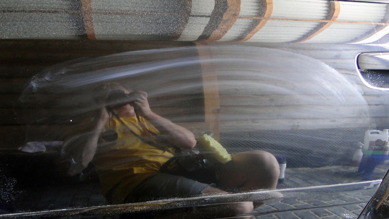 Wszystkie zuta poza tymi super najs maja tzw more, lub skorke pomaranczy - jak kto woli. Wlasnie ta nierownosc powloki powoduje znacznie pogorszenie odbic i szajnu, nawet jezeli lakier jest w 100% wolny od rys. Co z tym zrobic? Zabieg zwie sie wet sanding i polega na idealnym wyrownaniu powloki, przy okazji jakby automatycznie robi sie korekte lakieru. Wbrew pozorom, nie zbiera sie duzo wiecej lakieru jak przy "zwyklej korekcie" poniewaz scina sie pagorki. dochodzac do zaglebien w laierze - zeby nie byc goloslownym korekta przyjmijmy 3-5mikronow, wet sanding 5-8mikronow, sa to oczywiscie ogolne i pogladowe wartosci, ktore moga roznic na innych samochodach. Temat "mokrego piasku" nie jest mi obcy, bo robilem juz w ten sposob maske w swoim audi i dokladnie wszystko mierzylem. W sobote miernika nie mialem, bo stary pozyczylem a nowy przyjechal dzis, poza tym samochod nalezy do mnie, wiec krzywde zrobilbym tylko sobie. RS6 ma fabryczny lakier, niestety dotkniety fabryczna mora, postanowilem sie jej pozbyc, nie moze byc tak, ze "szefc bez butow chodzi" Zrobilem na potrzeby prezentacji kawalek drzwi pasazera, na zajawke dwie fotki, przed i po sadze, ze siwetnie oddaja efekt