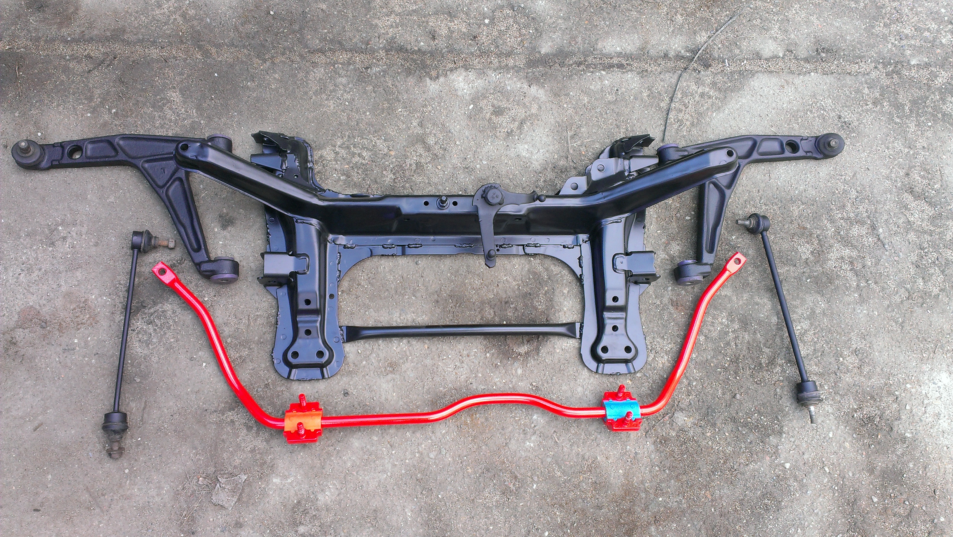 - w końcu pod auto trafiły wypiaskowane odmalowanie prochem sanie z GTI 1,6 wraz z wahaczami trójkątnymi, nowe gumy i łączniki stabilizatora, stabilizator z obejmami wypiaskowany pomalowany proszkowo na czerwono ;) Zamiast zwykłych tulei wahacza wjechał StrongFlex.
