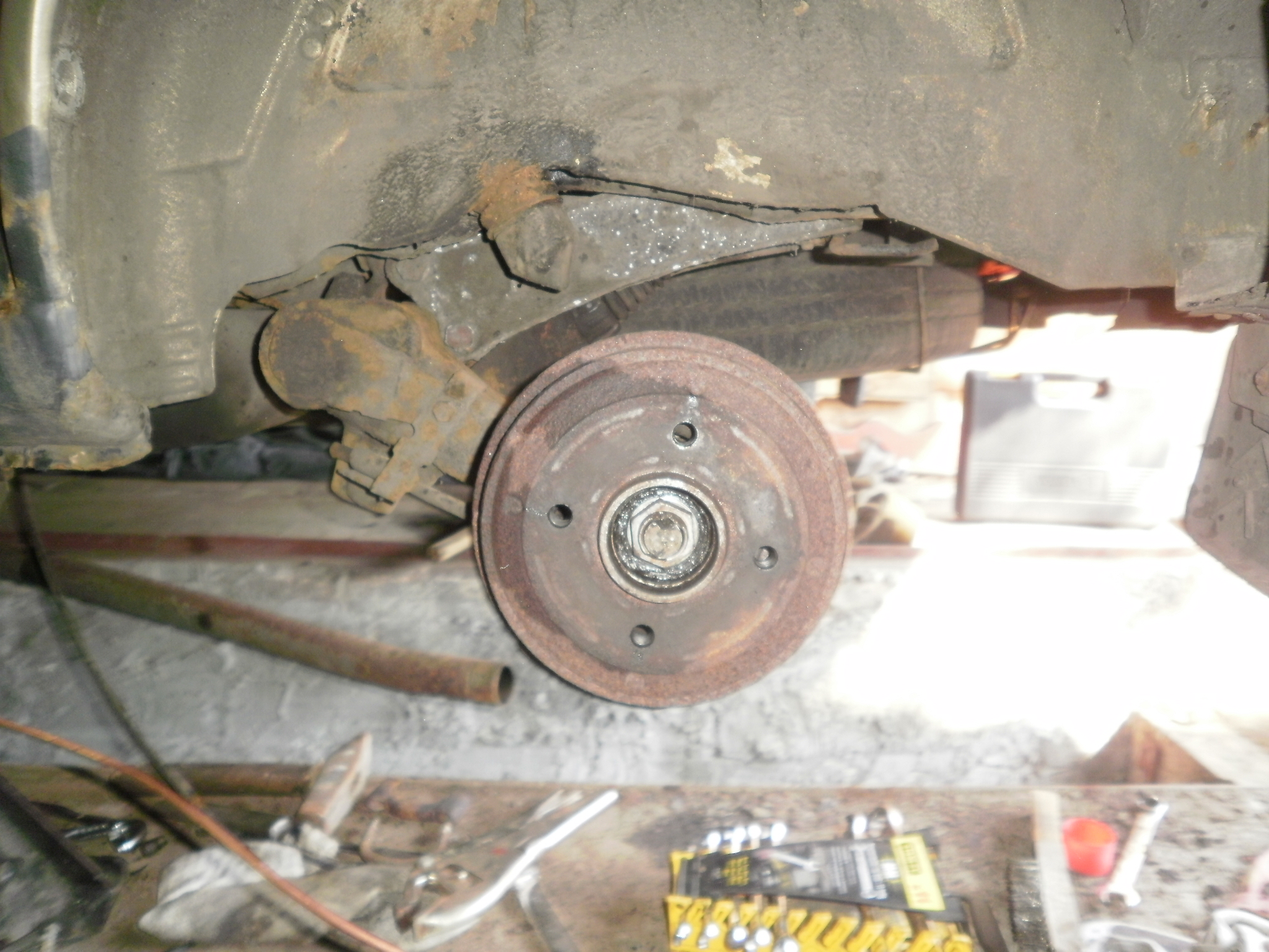 Zdjęcie koła od strony urwanego przewodu. Przewód ze starości zaniemógł. Wszelkie próby zagięcia przewodu choć na dojazd legły w gruzach. Po prostu łamał się w dłoni. Ogólna ocena stanu spodu przebiegła ok. Do wymiany na 100% szczęki bębnów. Bębny pozornie wyglądały na zmęczone, ale tak nie było. Świetny stan mimo korozji.