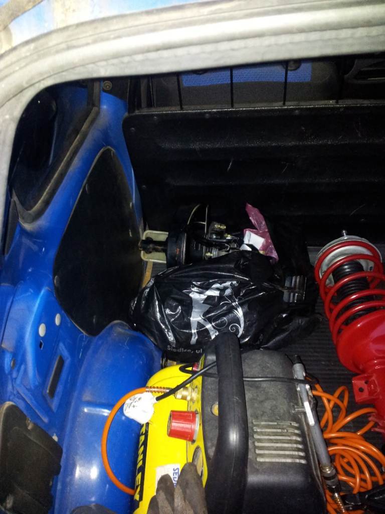 Wyciągnąłem też całe zawieszenie przednie z Grodziskowej budy. Wiozę je w poniedziałek do mechanika - niektóre elementy wylądują w moim samochodzie. 2 ramki koła zapasowego wraz z śrubą mocującą idą do piasku i proszku. Wykręciłem też serwo z pompą hamulcową, zaciski z nowymi klockami i tarcze - jak mechanik stwierdzi, że są lepsze - to lądują u mnie.