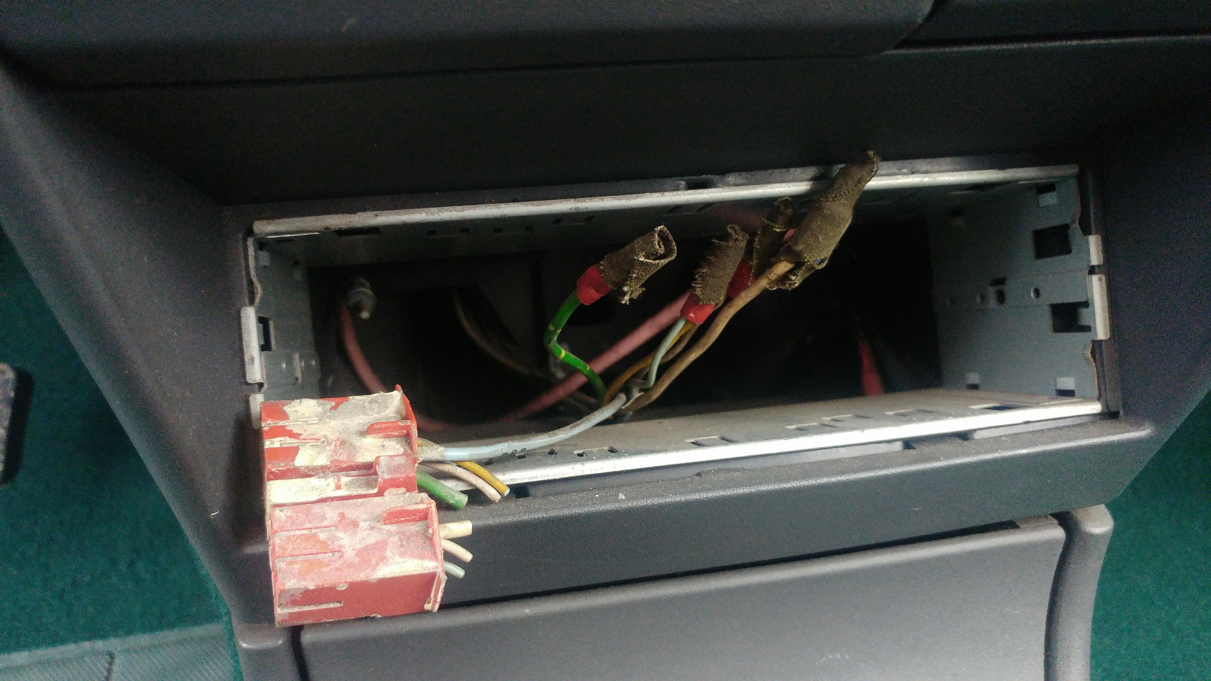 Zielona jest tylna półka, za to ma dwie urocze dziury po głośnikach. A'propos sprzętu audio - został wytargany. Kable poplątane i pourywane, w bagażniku resztki przewodów głośnikowych.