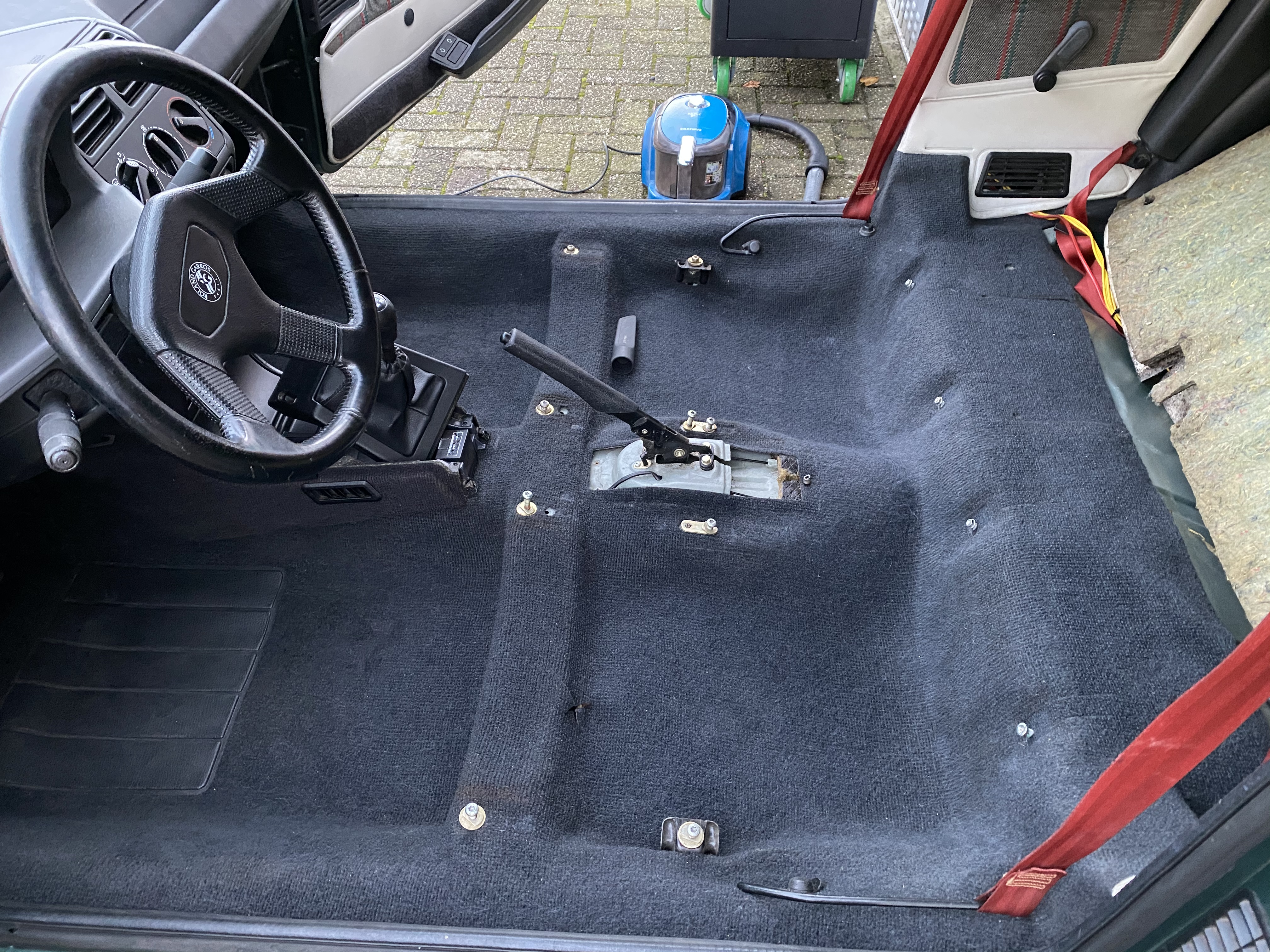 3. Wnętrze właśnie się „szyje”, wykładzina podłogi wyprana, wykładzina bagażnika obita czarna skórą z plastikowej świni