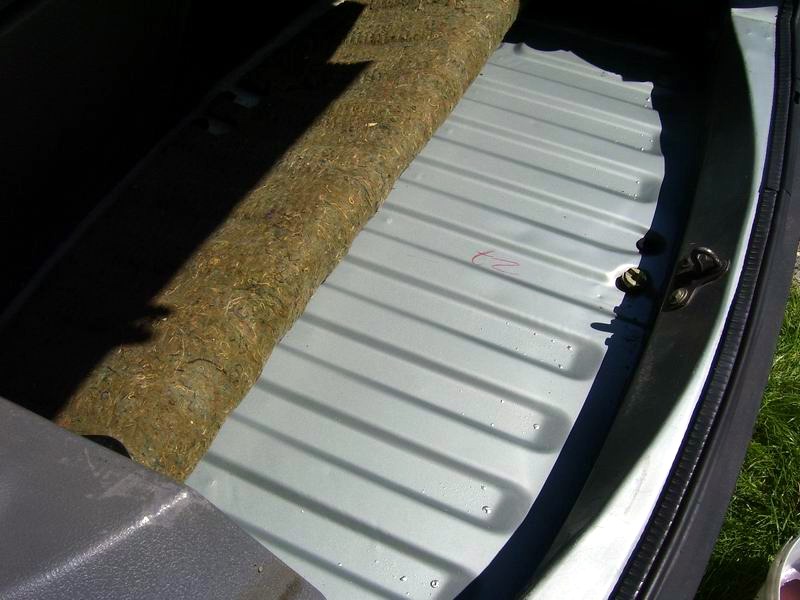 Najpoważniej wygląda rdzewiejący próg obok lewego tylnego koła. Maleńka purchla pojawiła się też tuż powyżej - na błotniku. Następnie zlokalizowałem rdzawy nalot przy łączeniu przedniego błotnika z progiem. Tam, gdzie są jeszcze fabryczne zabezpieczenia antykorozyjne. Kolejne miejsce - lewy przedni błotnik/nadkole. I ostatnie. Dolny narożnik prawych drzwi. Zapewne wynik przytarcia o krawężnik. Z niekłamaną trwogą zajrzałem także do bagażnika, skąd zimą dochodził mnie zapach stęchłej 25-letniej maty wygłuszającej. Jednak po jej podniesieniu oczom mym ukazał się tenże kojący widok: Okazało się, że jednak przez zimę nic mi tam nie zgniło, ani nie skorodowało. Bagażnik jest czyściuteńki i suchuteńki