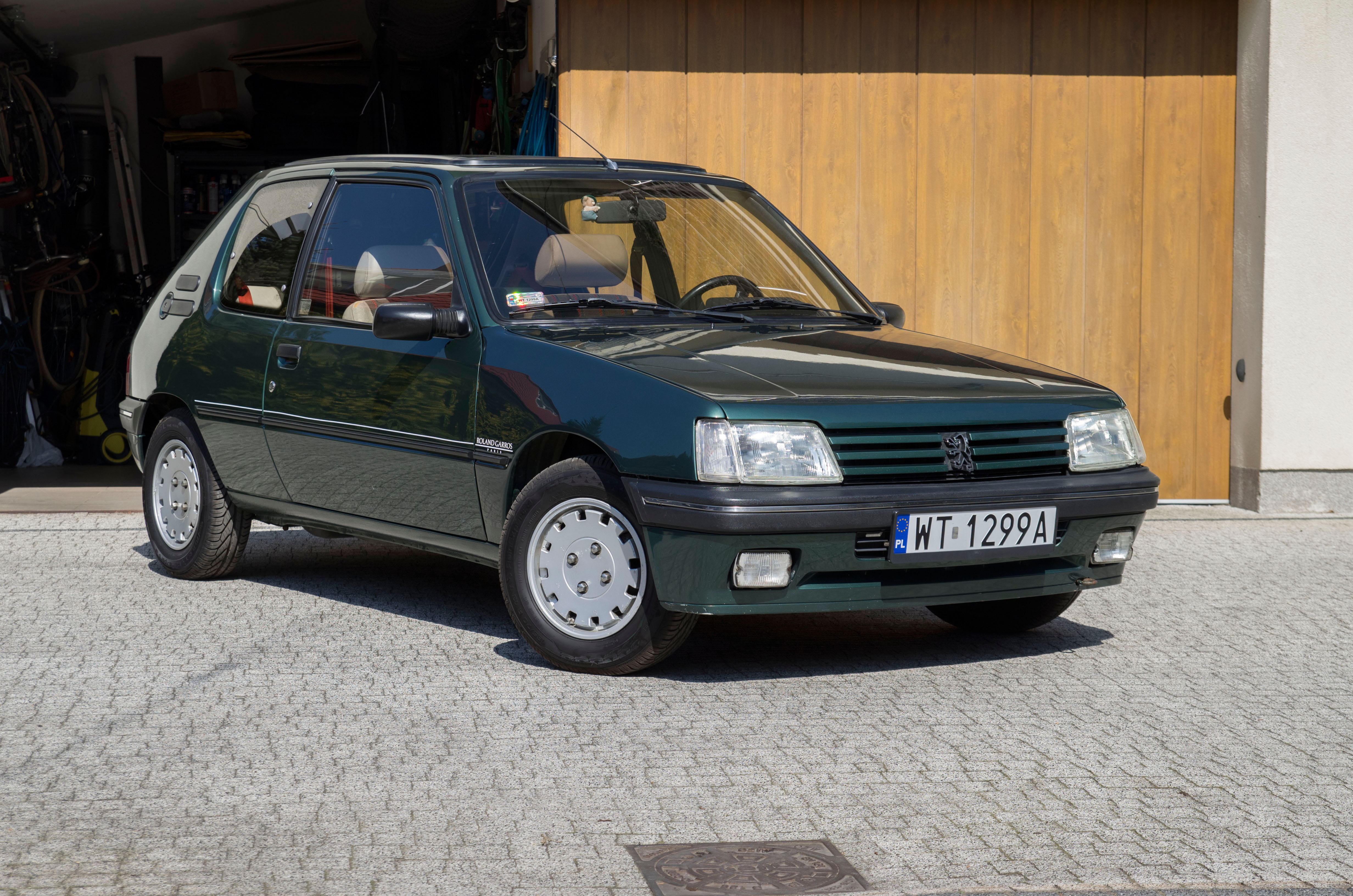 Lakiernik dumał i dumał, ale w końcu odebrałem maskę i błotniki. Lakiernik mówił, że miał duże problemy z dobraniem koloru, bo mieszalnie w ogóle go nie miały, a nawet jeśli, to fragment błotnika, który mu przekazałem wcale nie zgadzał z symbolem M1RP. Mówi, że symbol lakieru, który wybrał był inny i jest z nowszego modelu. Muszę w sumie dopytać go, czym w końcu to pomalował. Finalnie odebrałem elementy, na oko wszystko OK, spasowałem je w garażu, kolor wydaje się leżeć. Jest git. Tymczasem później, przy innym świetle okazało się, że kolor pasuje... no nie bardzo, co szczególnie widać na zdjęciach. Zacząłem drążyć temat i stwierdziłem, że: maska i błotniki po malowaniu pasują idealnie do grilla i dokładki, które mają oryginalną powłokę lakierniczą i pochodzą z dwóch różnych dawców (czyli ten kolor generalnie występuje w naturze) a z kolei fragment błotnika, który dałem lakiernikowi jako wzór pasuje mniej-więcej do tego co jest na bokach samochodu, ale nie pasuje zupełnie do dachu. Byłem umówiony ze znajomym, że spoleruje Peżota, żeby trochę zniwelować różnicę nowy vs. stary zniszczony lakier. Oczywiście, nie miało to wpłynąć na różnicę odcieni, ale tutaj znowu wyszło, jak bardzo potrzebny jest nowy lakier na reszcie samochodu. Choć jest pięknie wyciągnięty i nie ma rys, to nadal pozostawia wiele do życzenia ze względu na swoją fakturę i po prostu odbicia są słabe, szczególnie w porównaniu z nowymi elementami, które lakiernik rozlał całkiem ładnie. Po prostu należy mu się solidne zaspawanie dziury pod zbiorniczkiem, pewnie też wymiana przedniego pasa, bo obecny nosi jeszcze ślady ataków dziadka, który nim "jeździł" i nowy lakier na reszcie auta (teraz już oprócz maski i błotników), jednak muszę ten plan odłożyć na później, tak samo jak fotele. A skoro miałem już kupione niedrogie naklejki Roland Garros, to przykleiłem je. Mała rzecz a trochę w tym całym nie do końca udanym procesie poprawiła nastrój.