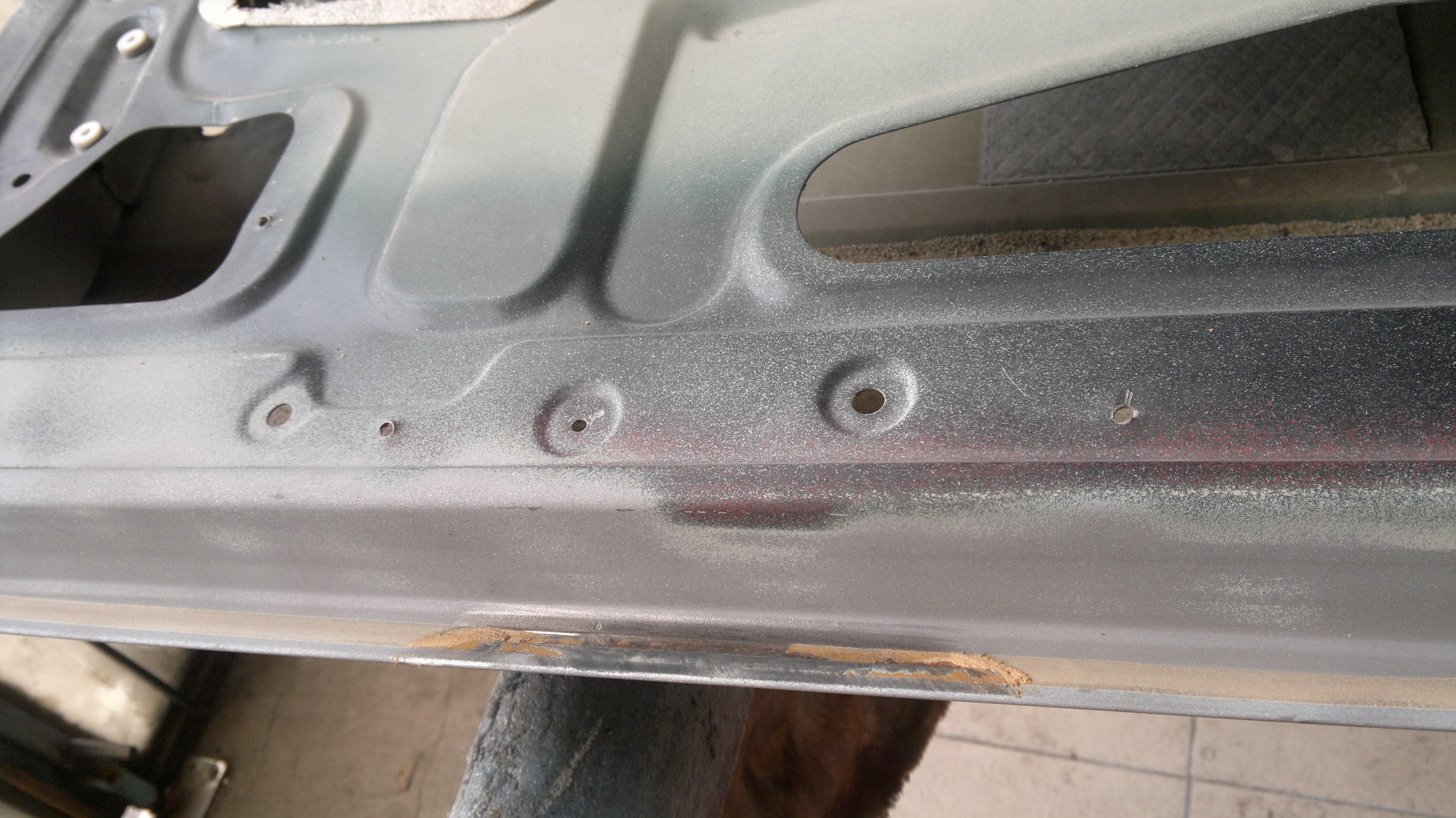 lakierem i dwoma warstwami uszczelnienia. Rdzy nie było widać i drzwi wyglądały na idealne, dopiero po zdarciu lakierowanego uszczelnienia udało się do niej dotrzeć