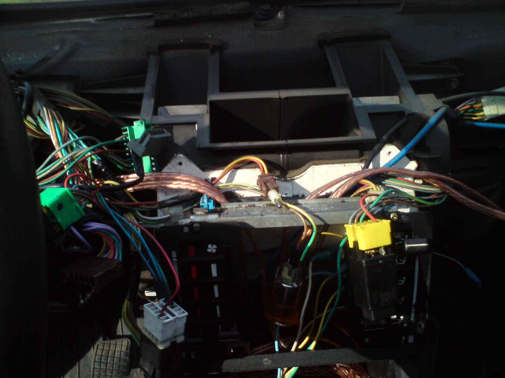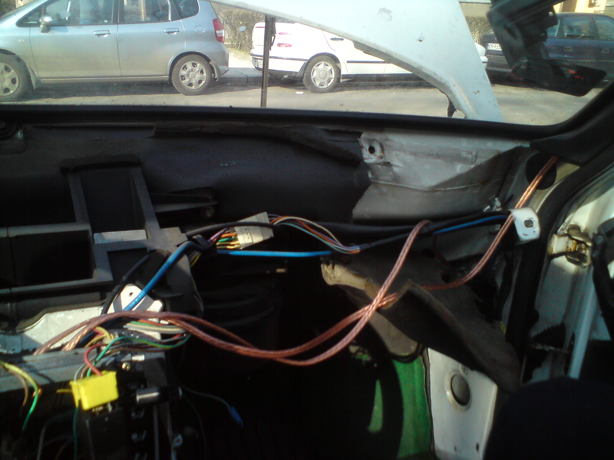 w między czasie doszły kable głośnikowe(grube miedziane na zdjęciach z pod deski rozdzielczej) przy okazji których rozebrało się tył wnętrza i odkryłem rozerwana pompkę tylnego spryskiwacza, głośniki odziedziczyłem z poprzedniego auta rodziców: Po zakończeniu prac pseudo blacharskich to jest w wakacje rozpocząłem karierę kierowcy.