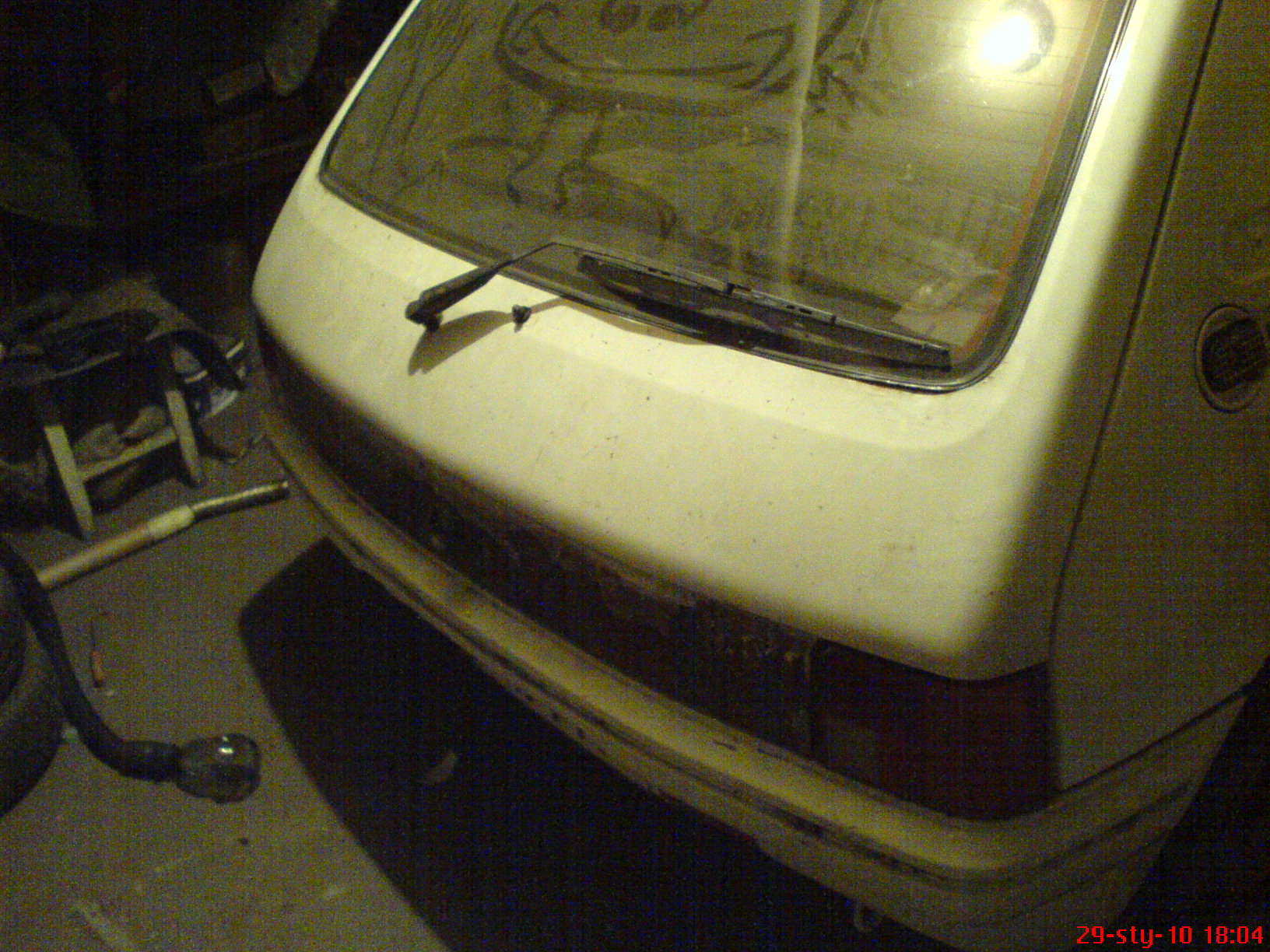 Oględziny tyłu przyniosły dwie dziury do bagażnika i brak kolejnych bocznych mocowań zderzaka. Zdecydowałem się usunąć całą rdze z przodu i z tyłu i tak zeszło parę tygodni doszły jeszcze nadkola a odeszły w niepamięć przody progów(pomniczek ze szpachli) wszystko co nie rozleciało się podczas oczyszczania zostało tymczasowo zabezpieczone podkładem i powierzchnią, a teraz będą nowe części przodu i progi, tył chyba uda się reanimować.