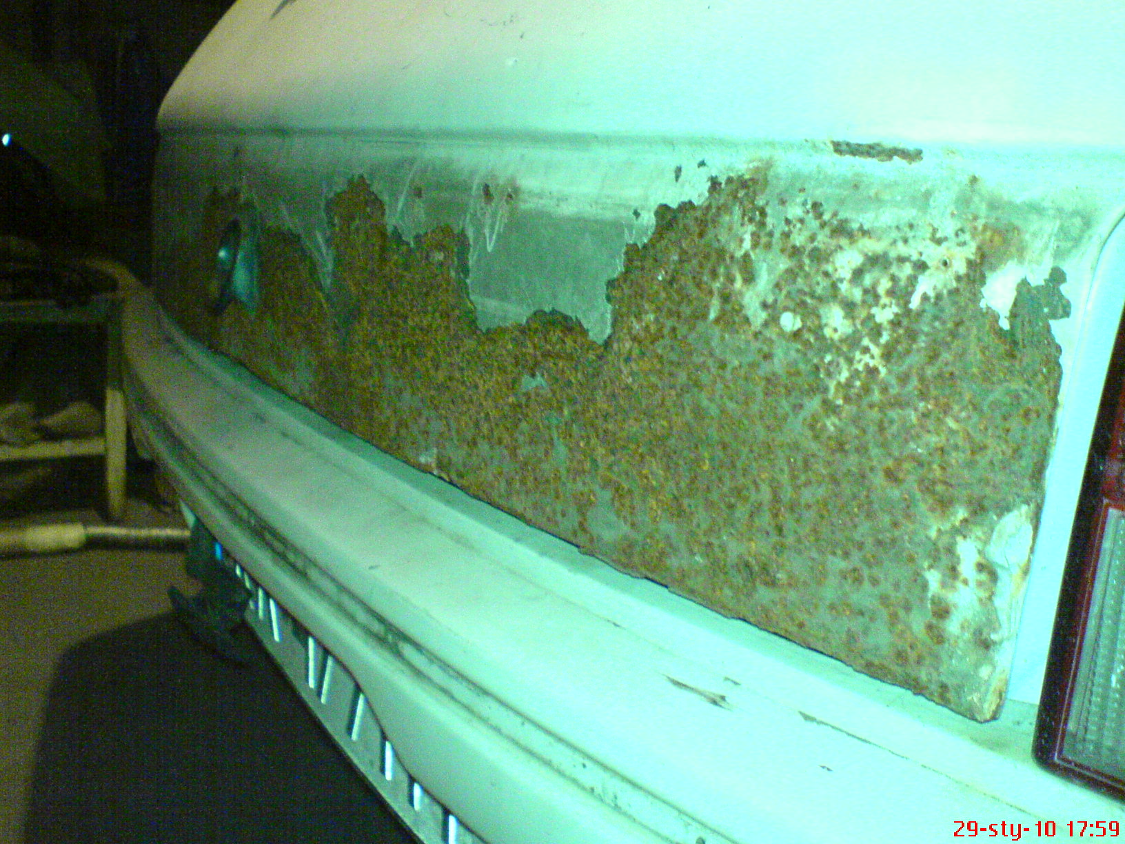 Oględziny tyłu przyniosły dwie dziury do bagażnika i brak kolejnych bocznych mocowań zderzaka. Zdecydowałem się usunąć całą rdze z przodu i z tyłu i tak zeszło parę tygodni doszły jeszcze nadkola a odeszły w niepamięć przody progów(pomniczek ze szpachli) wszystko co nie rozleciało się podczas oczyszczania zostało tymczasowo zabezpieczone podkładem i powierzchnią, a teraz będą nowe części przodu i progi, tył chyba uda się reanimować.