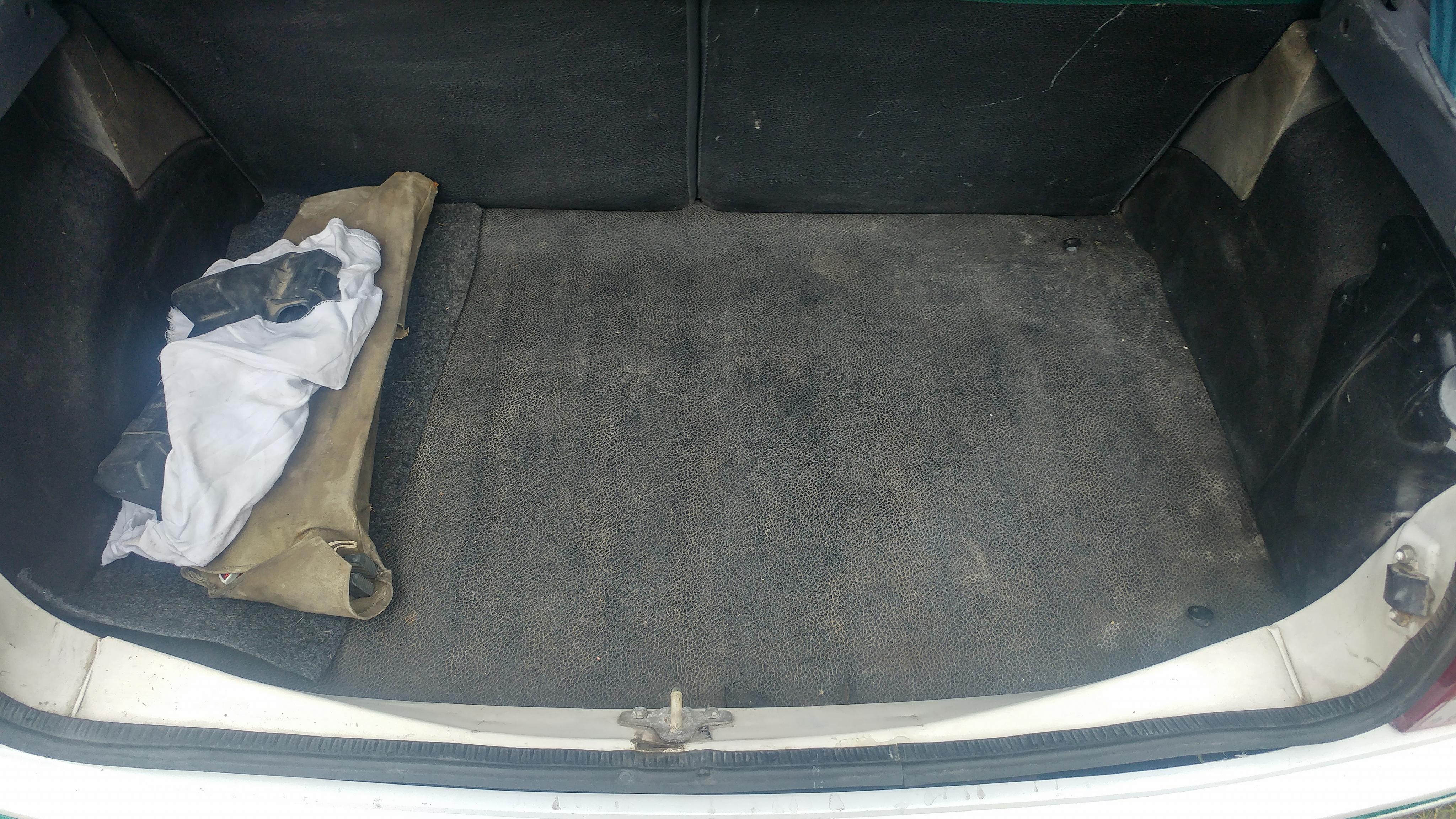 Zielona jest tylna półka, za to ma dwie urocze dziury po głośnikach. A'propos sprzętu audio - został wytargany. Kable poplątane i pourywane, w bagażniku resztki przewodów głośnikowych.