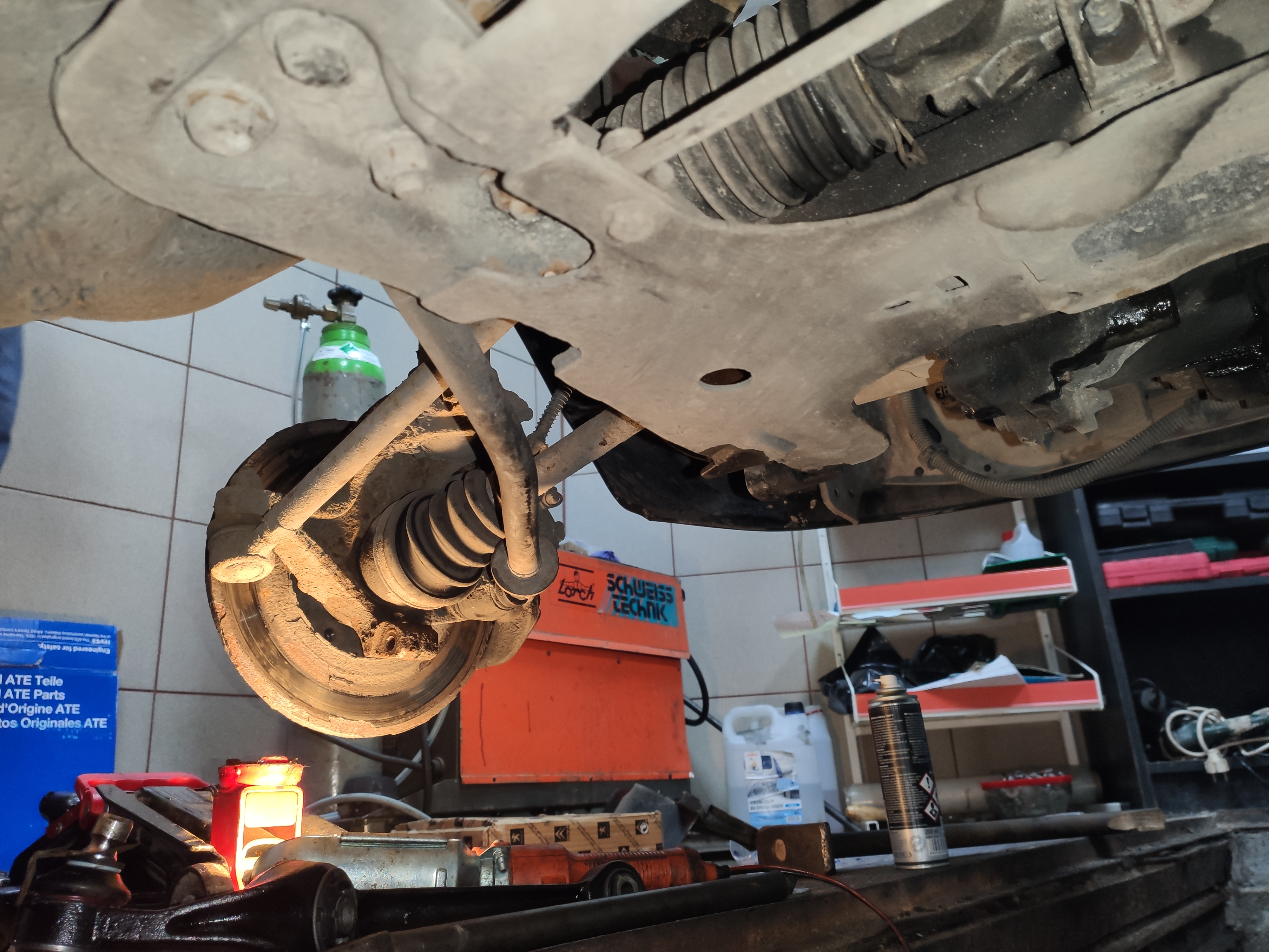 Będąc pod autem utwierdziłem się tylko w przekonaniu, że to dobra baza. Silnik i skrzynia suche, manszety w całe. Podłoga jak w nowym aucie _O_ Poza tym to standardowo do wymiany kwalifikuje się zawieszenie. Jak to w bendixie klocki hamulcowe hamują powierzchnią co najwyżej klocka LEGO. Dlatego kolejny etap to wymiana: