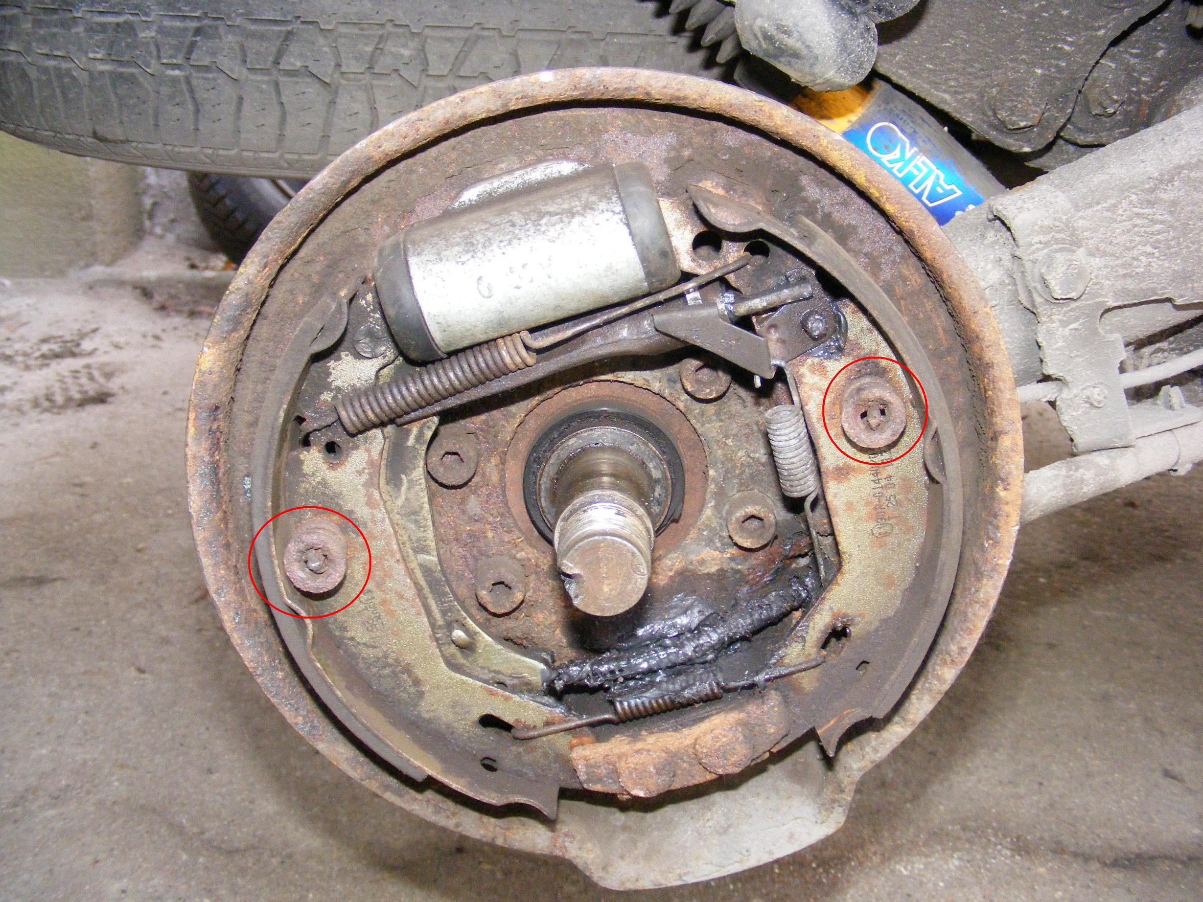 Jak mi się zablokował ręczny po"dynamicznym"zaciągnięciu to się okazało,że puścił świeżo wymieniony sworzeń, który przytrzymuje okładziny to tarczy kotwicznej(na zdjęciu w kółku). Skutkiem było dociśnięcie jednej okładziny ciernej do środka bębna, a za pośrednictwem samo regulatora drugiej okładziny do jego średnicy zewnętrznej. Wymieniając te części sprawdzajcie ich spasowanie ze sobą - oryginalne wytrzymały mi kilka lat.