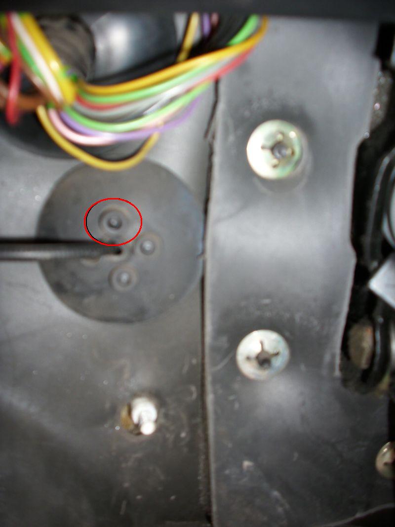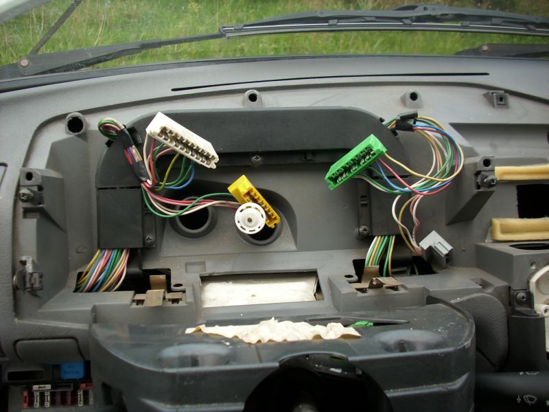 Jedna uwaga do powyższego opisu. W przypadku daszków od liczników typu bieda, konieczne może okazać się także odkręcenie koła kierownicy, które uniemożliwia przesunięcie daszka do przodu podczas wyciągania. Przynajmniej tak było u mnie. 2. Należy również odkręcić plastikową półkę spod kierownicy, w celu lepszego dostępu do tablicy z bezpiecznikami, kostek PC1 i PC2 oraz otworu, którym przeprowadzimy kable z komory silnika do wnętrza. Po odkręceniu półki zauważycie po lewej stronie na bocznej ściance kostki. Pierwsza to 9-pinowa kostka PC2, a następna to 7-pinowa kostka PC1.