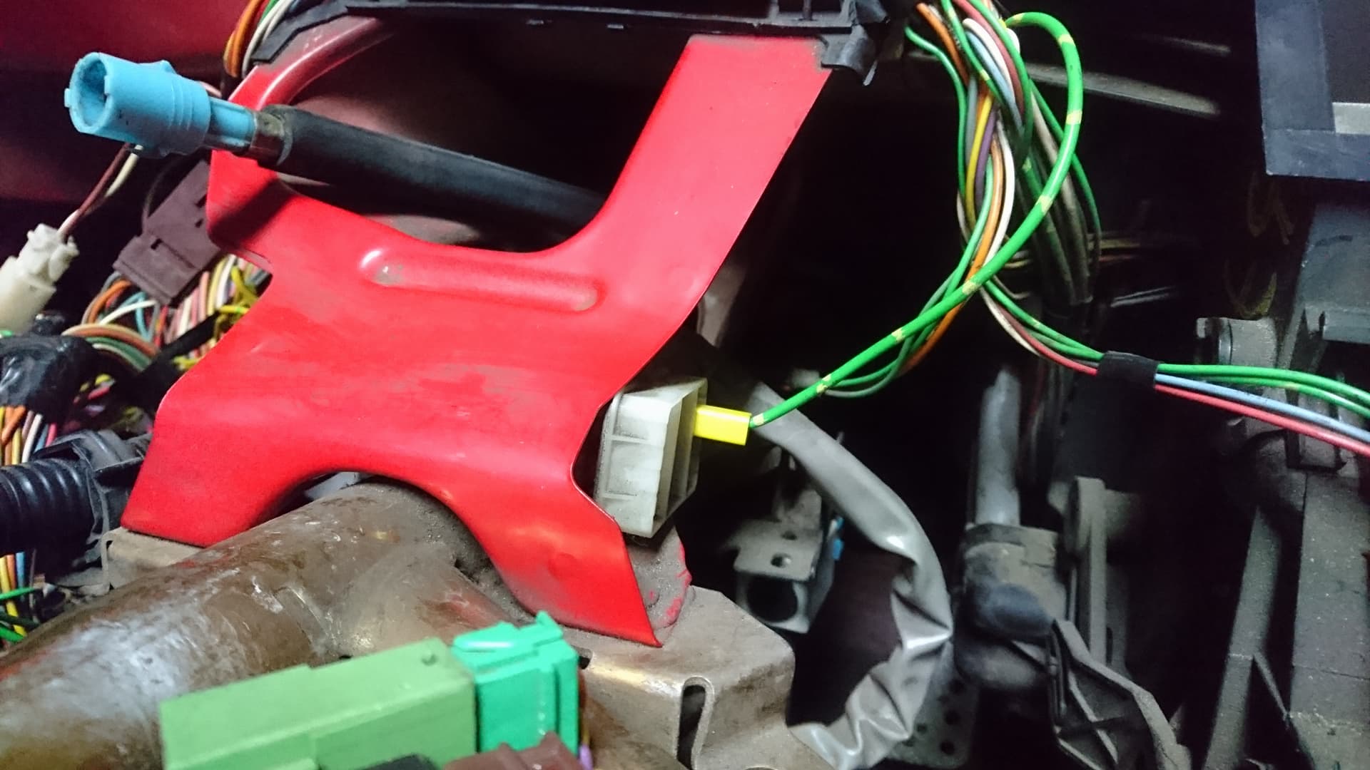 Tutaj na foto pojedynczy zielono żółty kabel wpięty do kolumny kierowniczej, w to miejsce wpiąłem brązową kostkę ze zdjęcia powyżej. Czy w tym miejscu powinno być wpięte coś jeszcze?
