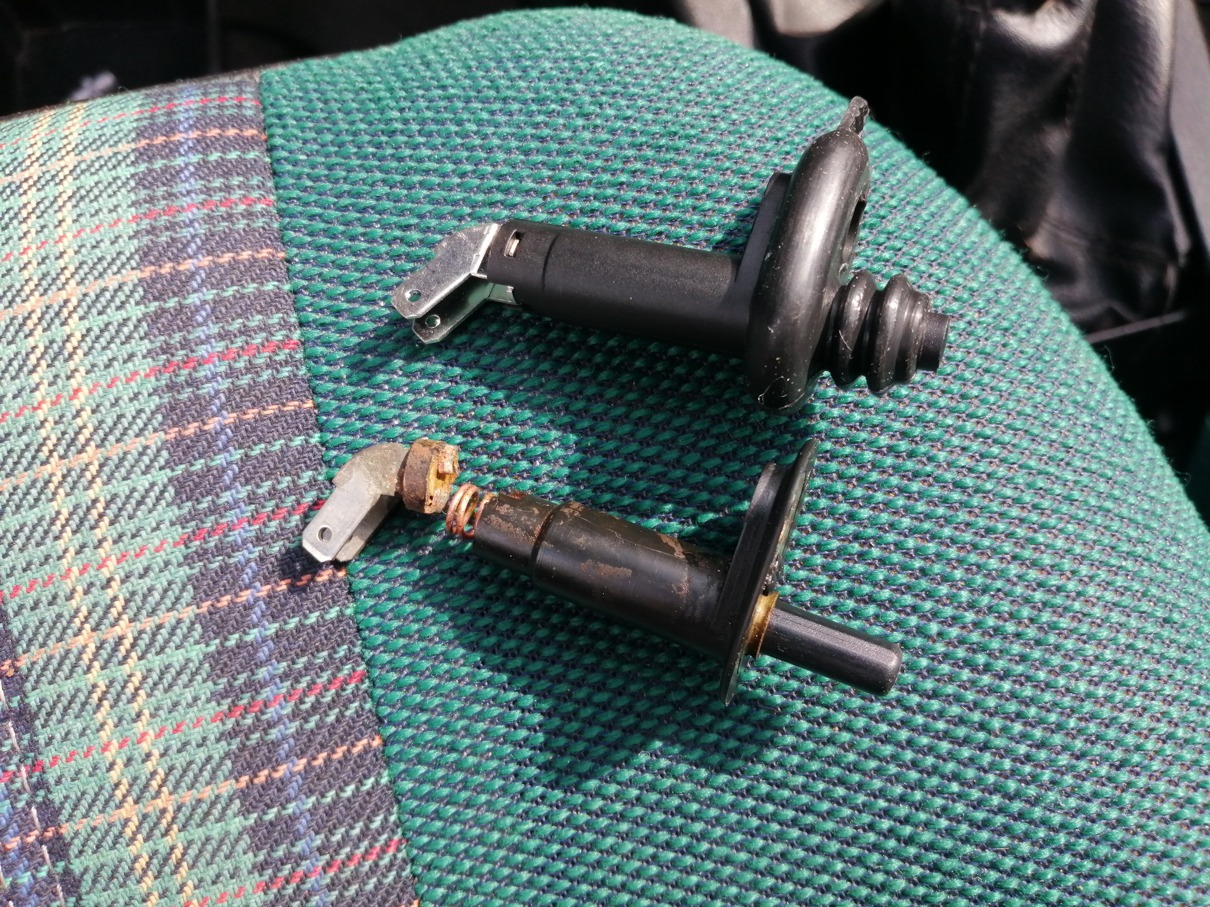 Dawno w tym wątku nic się nie pojawiało, jest to spowodowane tym że Peugeot dzielnie jeździ codziennie bez problemów. Na szczęście niedawno pojawiła się okazja żeby wymienić małą część i coś pogrzebać przy aucie :) Pewnego dnia Green nie odpalił, lecz nie ze swojej winy, wcześniej zostawiłem włączone światła które rozładowały akumulator, przy otwieraniu drzwi nie słyszałem sygnału że światła są włączone, powodem braku piszczenia był niedziałający czujnik otwarcia drzwi. Po 30 latach, nacisk sprężynki na stary plastik spowodował że czujnik się rozleciał. Zakup nowego czujnika za kilka złotych i łatwy montaż usunęły problem.