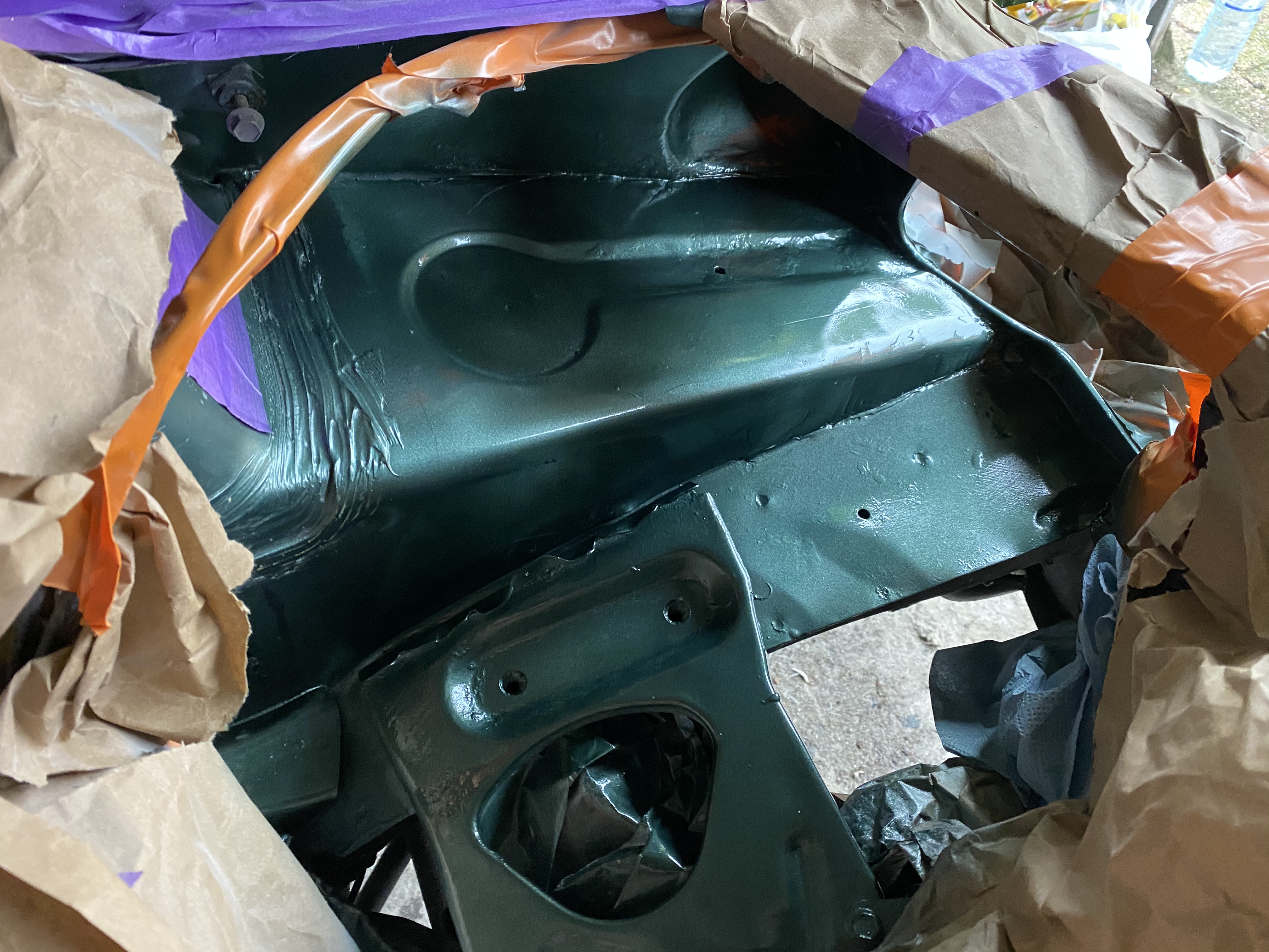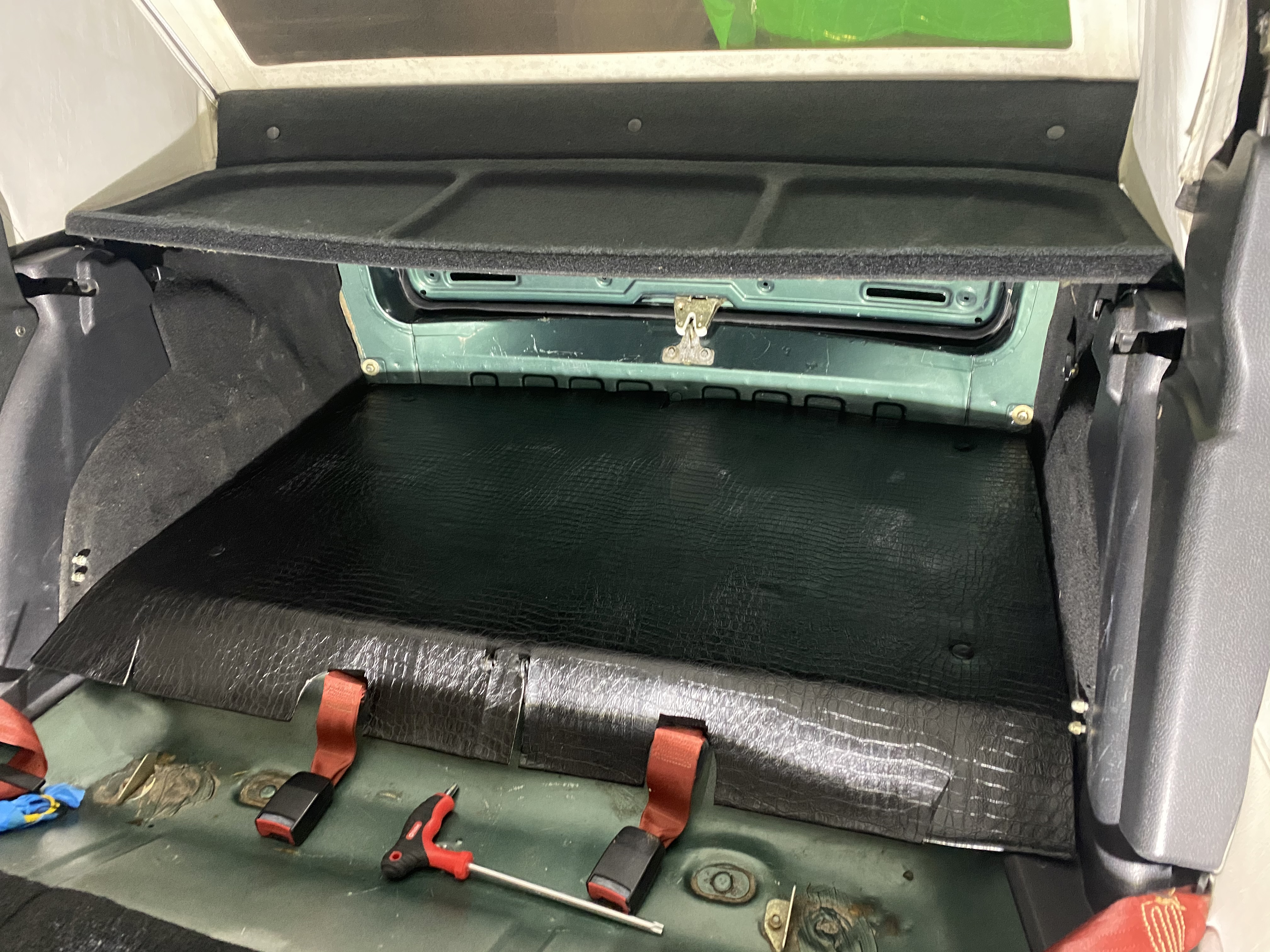 3. Wnętrze właśnie się „szyje”, wykładzina podłogi wyprana, wykładzina bagażnika obita czarna skórą z plastikowej świni 😆 do tego nowy mieszek i gałka zmiany biegów.