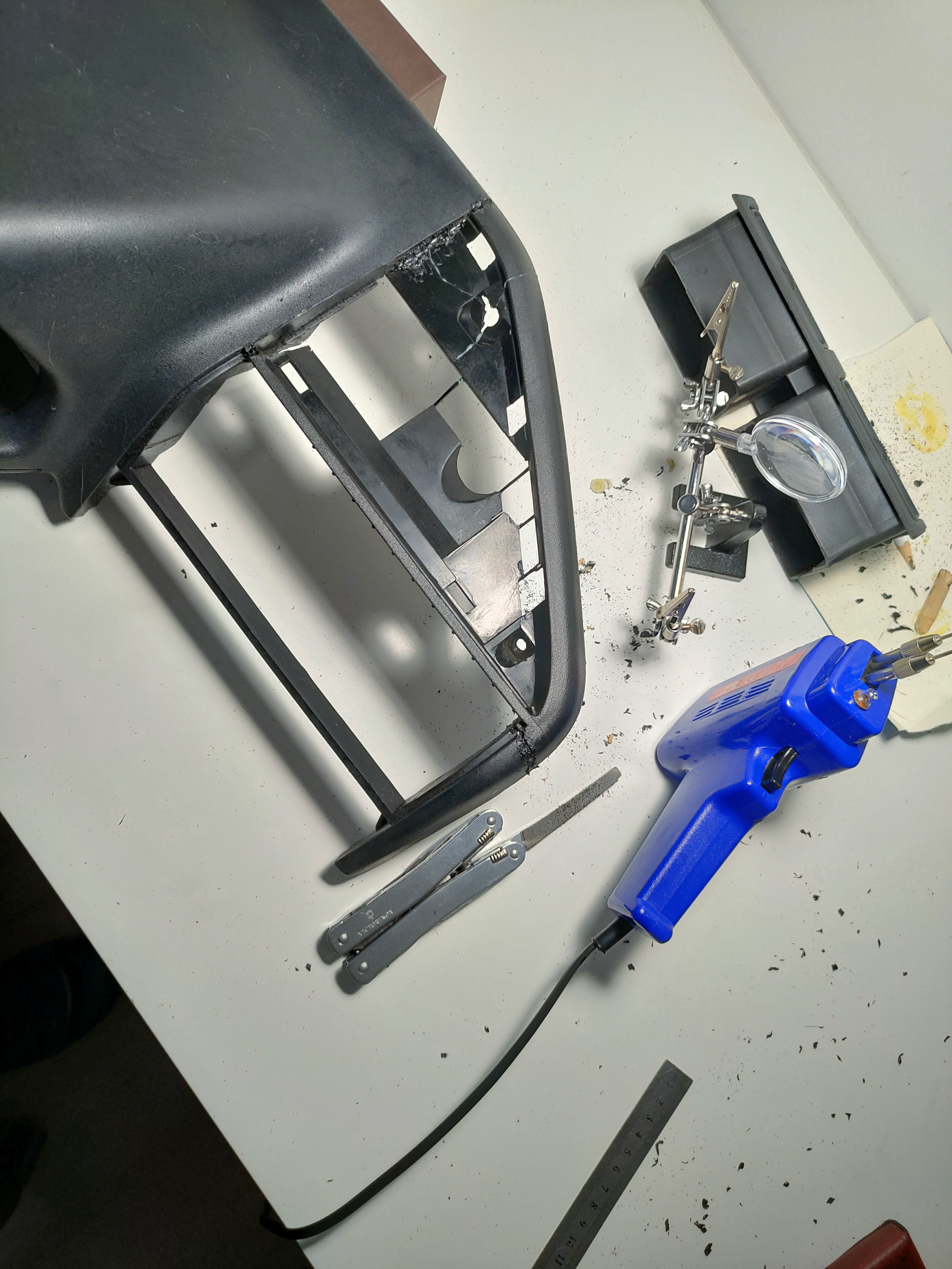 Kolejną istotną zmianą był upgrade wskaźników zegarowych, to jest montaż nowego obrotomierza z prędkościomierzem oraz wskaźnikiem temperatury płynu chłodzącego. Od dawna to planowałem, jednak dopiero teraz się udało to zrealizować. Nabyłem zegary jeszcze w zeszłym roku, potem polowałem na duży daszek. Niestety, jak wiadomo, nie jest to prosta sprawa. Zbierałem więc co wpadnie w ręce. I tak upolowałem daszek, który miał zniszczony fragment z monetnikiem. Chwilę później trafiłem na ofertę 205 XS z szarym wnętrzem na szaber. Udało mi się zakupić daszek z niego, ale niestety dotarł do mnie w formie puzzli. Postanowiłem spróbować przeszczepić z niego monetnik. Niestety nie wyszło to najlepiej, a co więcej, wpadłem na genialny pomysł podgrzania całości celem poprawienia struktury starego wypalonego przez słońce plastiku. W efekcie stopiłem cały ten fragment, przez co zgubił on swoją odpowiednią fakturę oraz co gorsze geometrię. Kolejnym dość radykalnym pomysłem na jaki wpadłem było zrobienie daszka "frankensztajna" i sklejenie ze sobą dużego z biedą. I w ten sposób, korzystając z brzeszczotu, kleju dwuskładnikowego, szpachlówki do plastiku oraz lakieru strukturalnego w sprayu uzyskałem całkiem zadowalający efekt, który dało się bez wstydu założyć do auta. Upiekłem dwie pieczenie na jednym ogniu, ponieważ jednocześnie mam duży daszek oraz nie mam monetnika, który jak wszyscy wiedzą lubi się zepsuć. 8)7