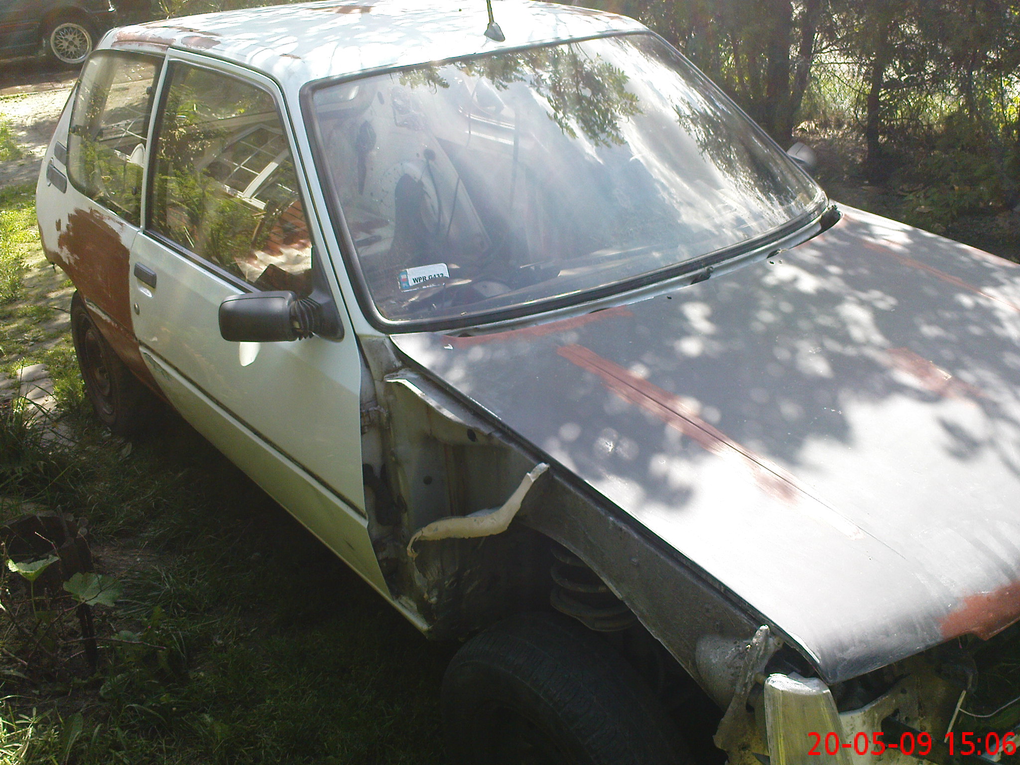 Naszczęście blacha nie oparła się w tych miejscach nadmiaru wilgoci i nie było widać żadnej rdzy .Tak więc, z oględzin wynikało jasno, że błotniki, drzwi nadaja się tylko na złom.W tym samym czasie zaczęły się wiec ich poszukiwania m.in na forum , i od czasu do czasu przeglądając allegro,Maska z garbem podarowana mi została do CTI dlatego tez początkowo do auta trafiła maska z CT ,(niestety jej stan był kiepski wewnątrz komory) , a później już finalnie maska z CTI w idealnym stanie .Po drodze przy wyjmowaniu pękła mi przednia szyba ;/ której tak apropo nie mamy do dziś.