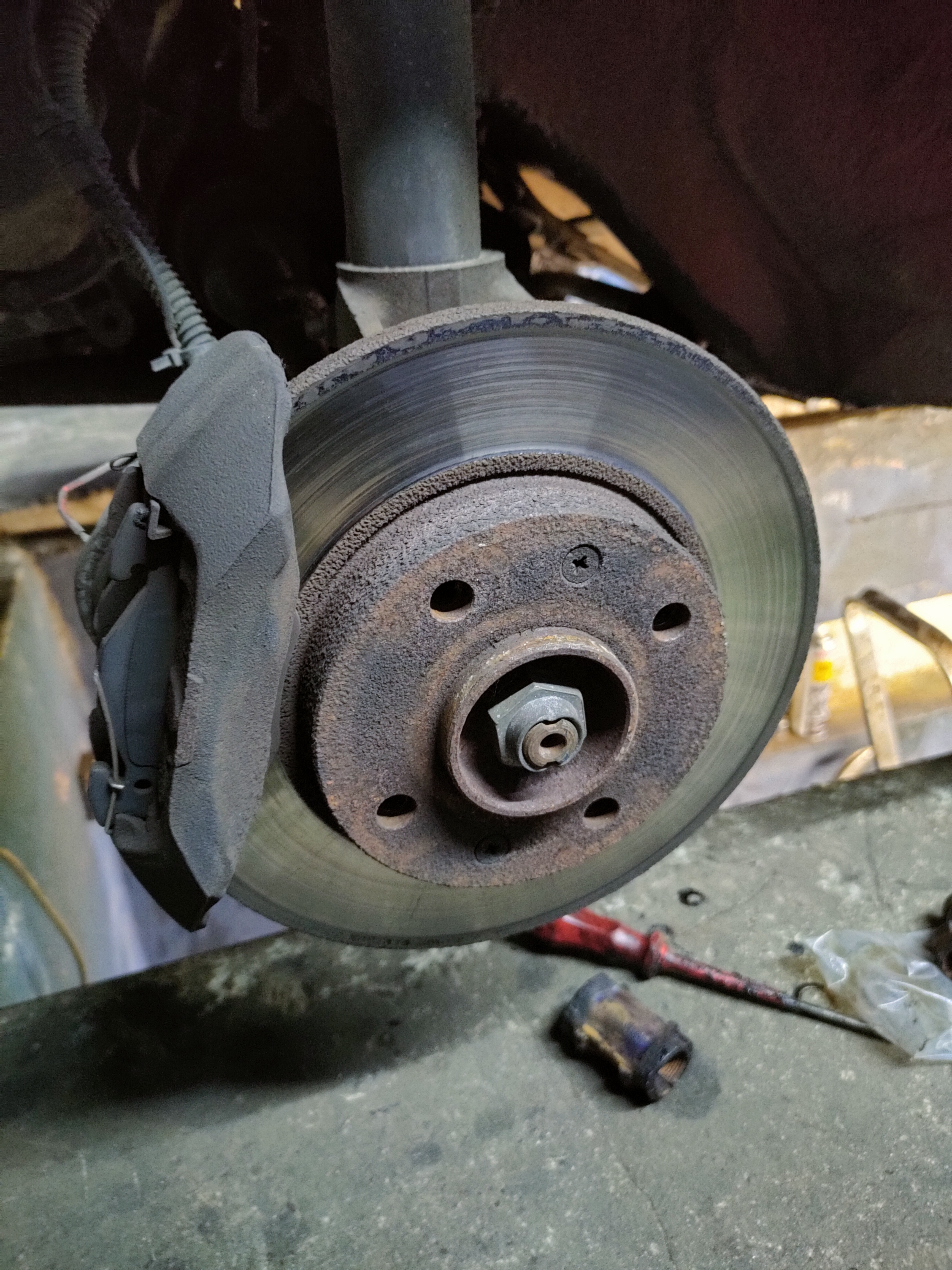 Spodziewałem się problemów przy pracy, ale nadeszły one na samym początku - żadna ze śrub trzymających tarcze nie puściła. A jako początkujący amator, oczywiście nie miałem ze sobą wiertarko-wkrętarki... Do walk musiałem wrócić po zaopatrzeniu się w taki sprzęt, rozwierceniu starych śrub i ponownym nagwintowaniu piasty pod nowe.