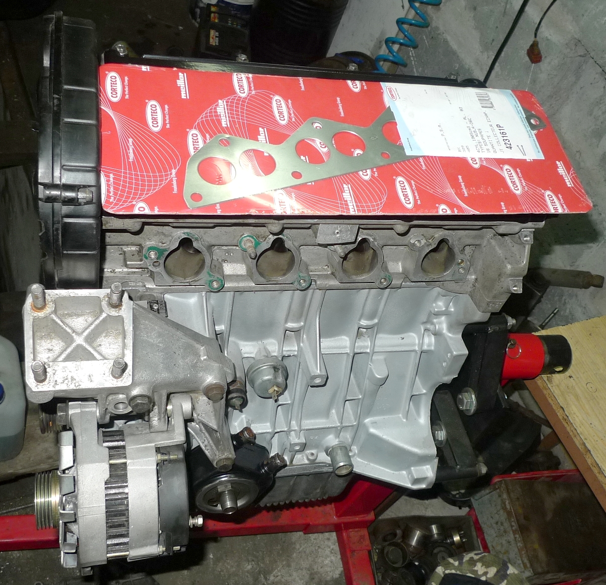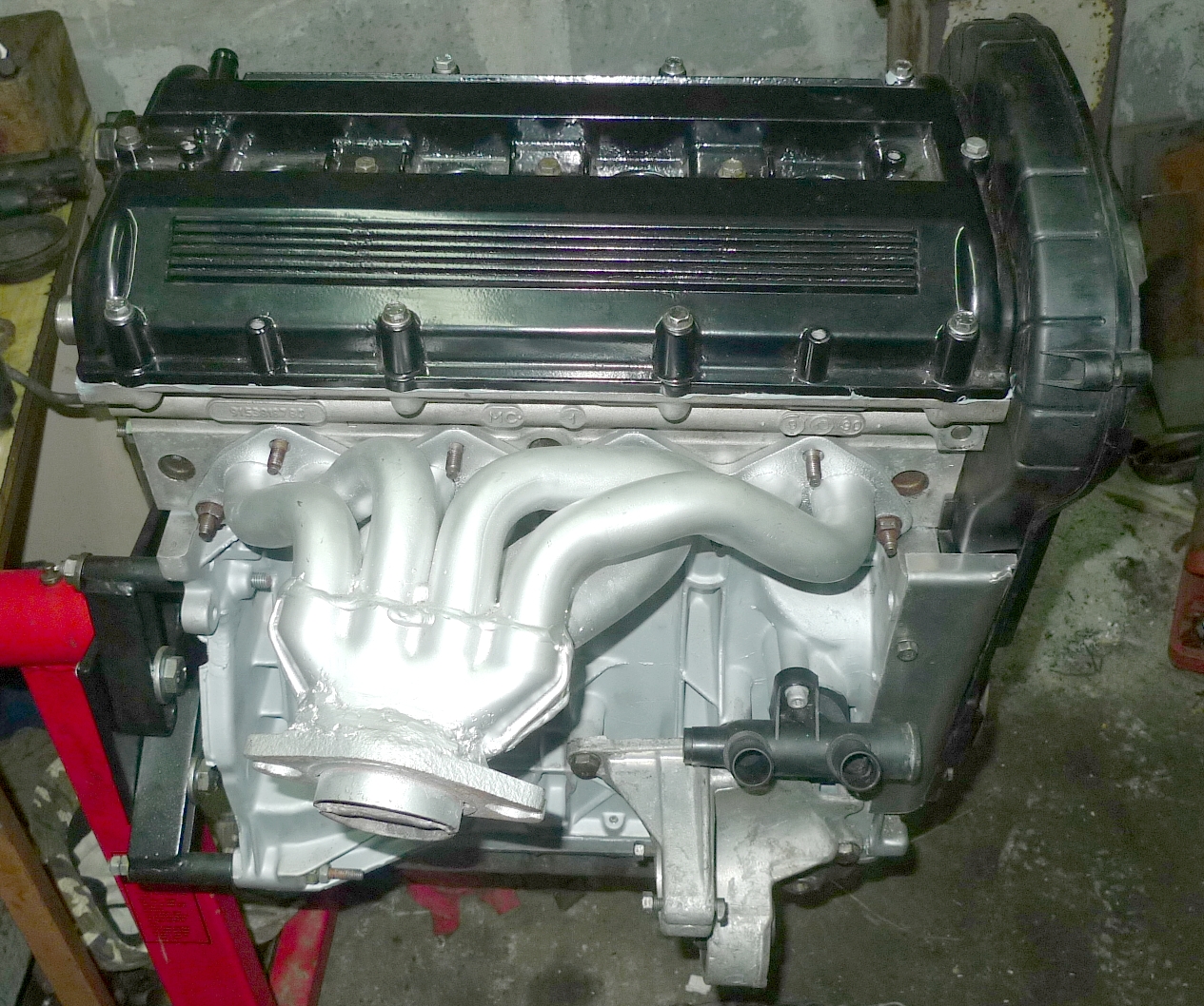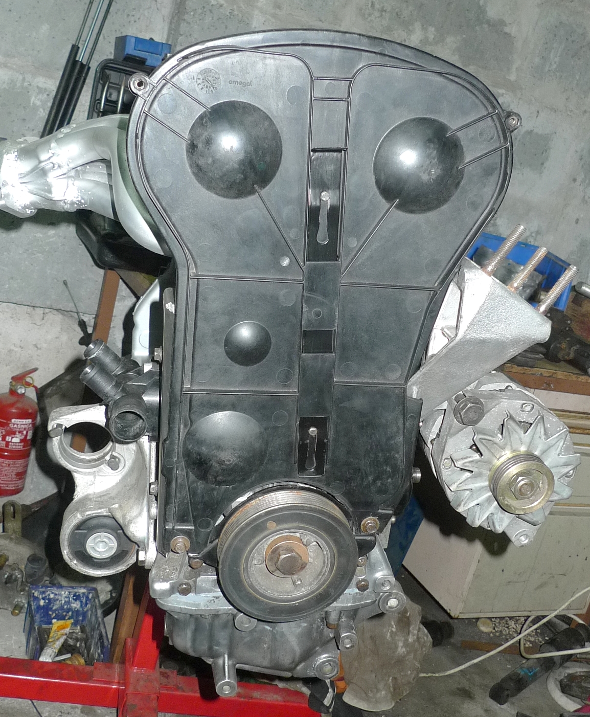 Nastąpił mały update prac, przykryte zostały pasek rozrządu oraz wałki, zamontowano alternator, chłodniczkę oleju, czujniki, króciec wodny, dolne mocowanie silnika ( nowa tuleja Sasic ) itp itd...