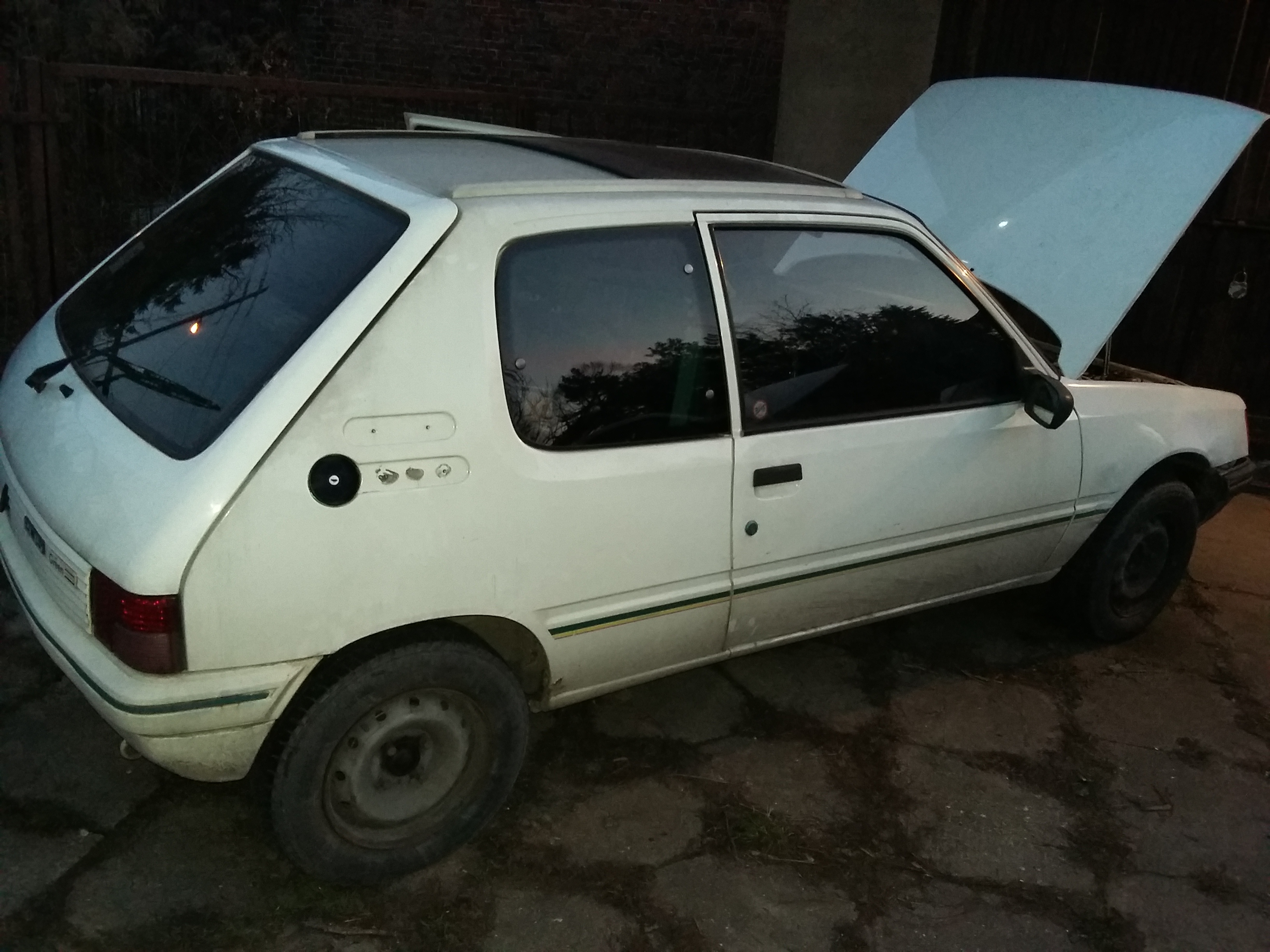 Po długim zastanowieniu, nudzie w sobotni poranek w pracy i wygrzebaniu znikomych fot mojego niedawnego nabytku (jest ich mało bo uważam że jeszcze nie jest sie czym chwalić:p) postanowiłem pokazać moją 205 w dieslu. Po sprzedaży mojego poprzedniego daily (ori Golfa 2 gti 16V) przyszedł czas na poszukiwanie czegoś co powinno być z założenia niedrogie w użytkowaniu...po obejrzeniu jakiś 15 samochodów które okaząły się blacharsko słabizną przyszedł czas na peugetoa. podkreślę że nie szukałem konkretnie auta z pod znaku lwa:) Historia samochodu dość ciekawa ponieważ miał tylko dwóch właściceli, kupiony w Łódzki salonie w 91 roku przez starszą panią po czym odsprzedany 10 lat temu sąsiadowi który zakupił go dla córki. Wszystkie dokumenty typu książki itp, przebieg 150 tys km. Maska do wymiany ponieważ jakis stolarz ją rzeźbił na rancie po delikatnej przygodzie. Generalnie samochód cąły w ori bez kolizji prócz wspomnianego rantu maski. Zawieszenie z przodu wesoło sobie postukuje(już nad tym pracuje i zbieram fanty), odzywa się podpora półosi, miał przepalony wydech (juz wymienione), automat od ssania( nowy) i jeszcze patu innych o których pewnie zapomniałem wspomnieć. Dokupiłem do niego tydzień później dawce maski i paru gratów czyli green'a. Generalnie plan jest przywrócić autko do stanu godnego użytkowania + korekta i cycek oraz jakieś koło i pewnie parę drobiazgów O-)