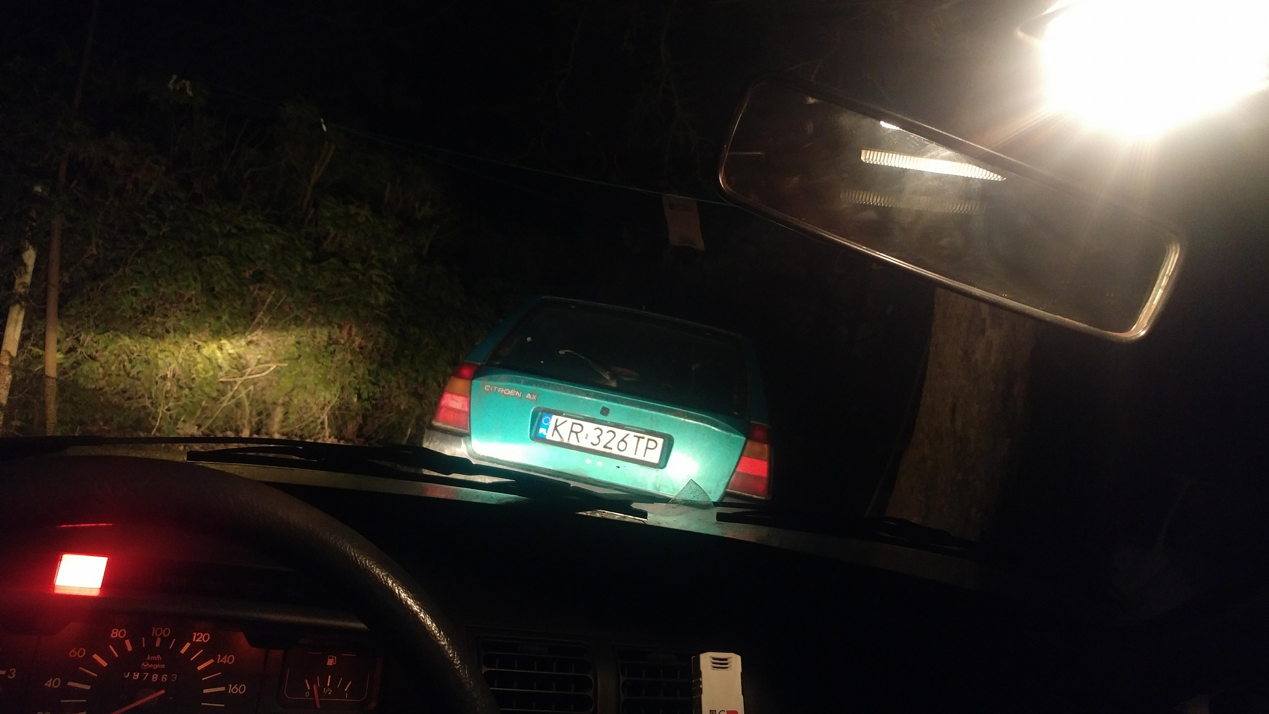 Na pocieszenie, zakosiłem z zaparkowanego w pobliżu Citroena AX (służy jako powierzchnia magazynowa części) sprawną lampkę podsufitki. Poprzednia przy wyciąganiu straciła połowę ząbków mocujących i niestety skazała się na recykling. Do listy zakupów dopisałem krańcówki drzwi.