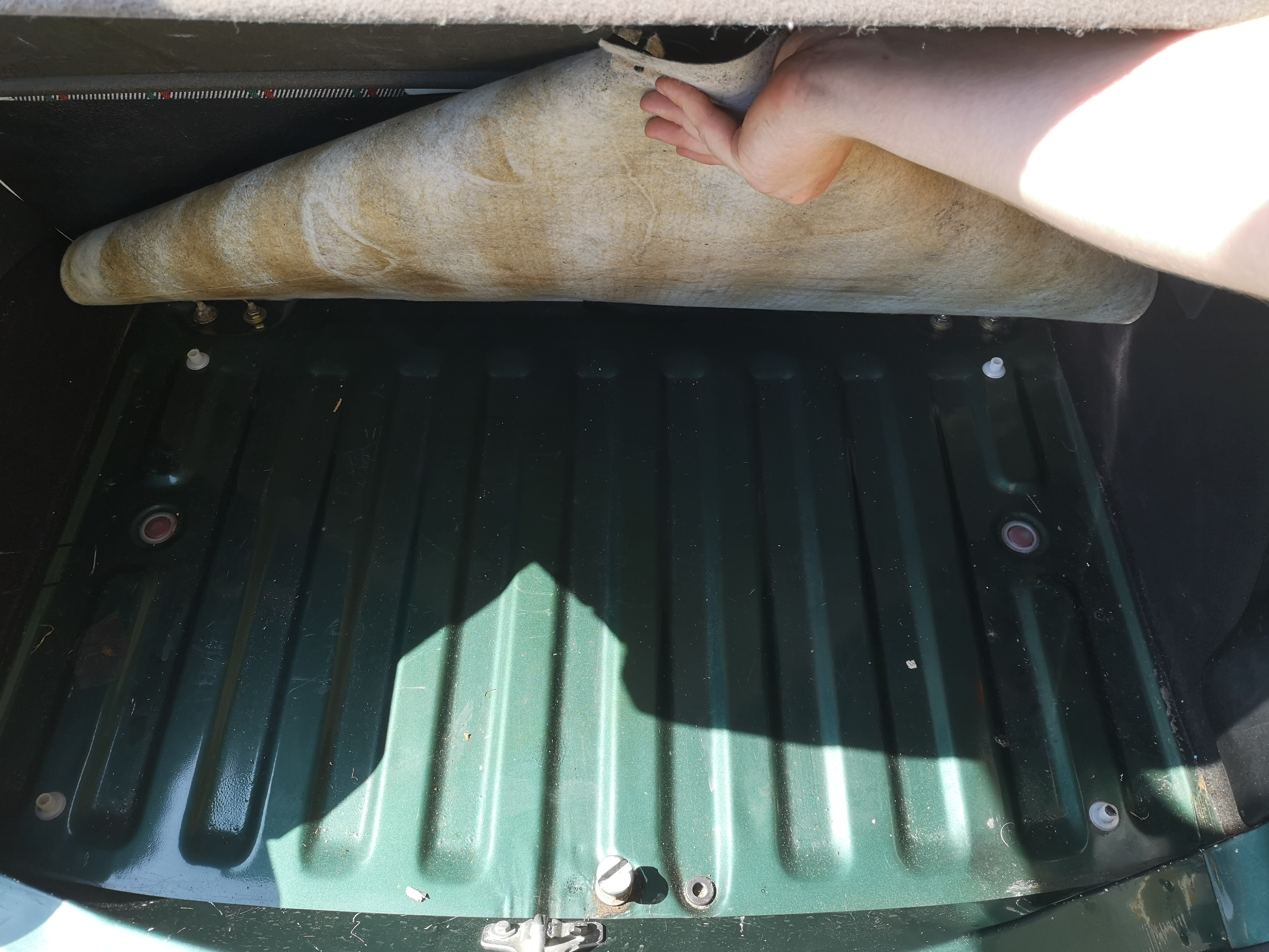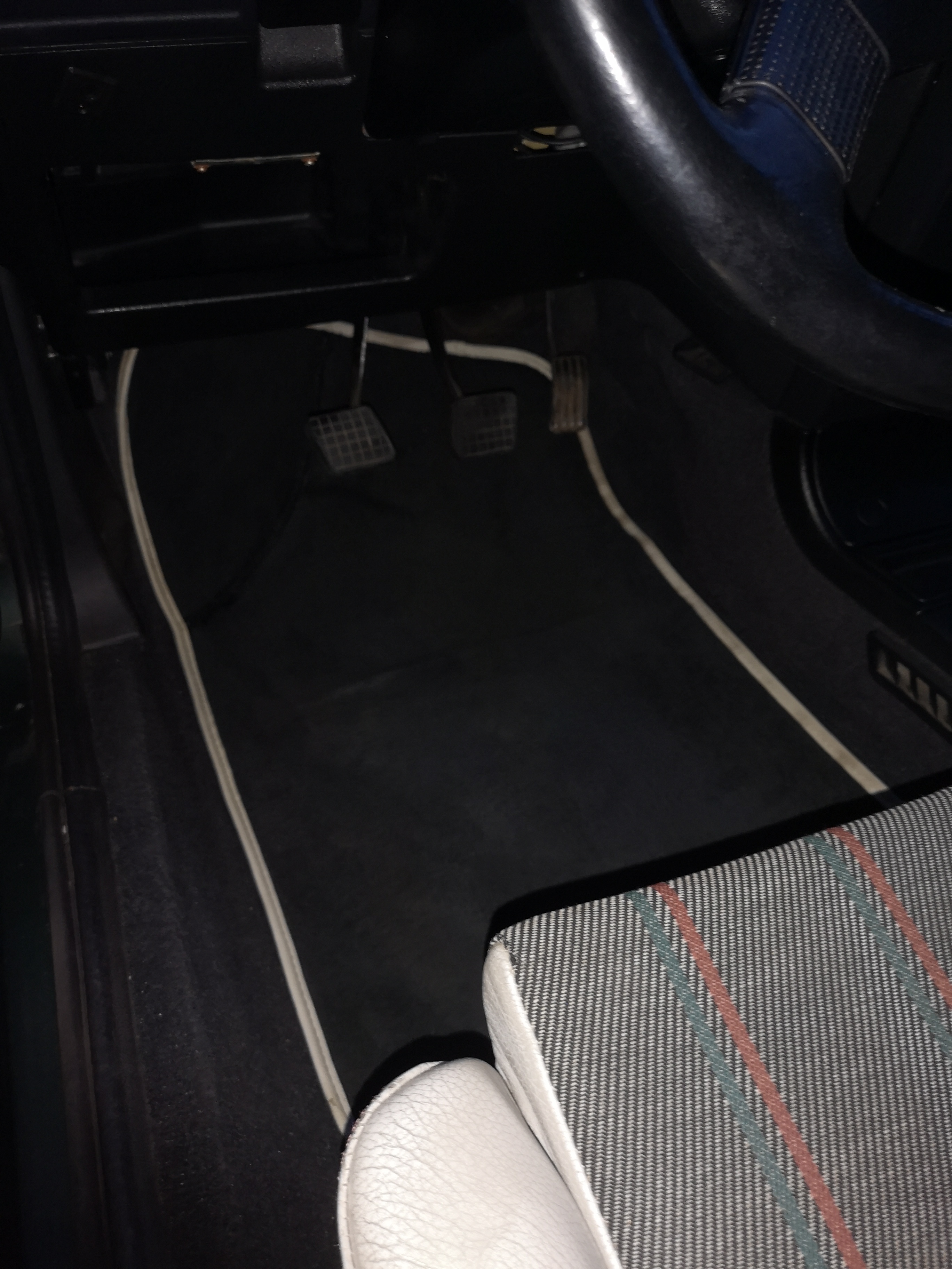 Blacharsko samochód trzyma się świetnie. Progi, podłoga są bez rdzy, nawet praktycznie bez nalotów. To było główne, co przekonało mnie do niego. Lakier jest jaki jest... Można go solidnie przepolerować (jest w zdecydowanej większości oryginalny), ale nie wiem czy jest sens, bo jednak jest poobijany. Bardzo nie podoba mi się też spas maski, bo szpary między błotnikami są duże i niezbyt równe. Jeszcze nie myślałem, jak to poprawić. Na pewno muszę wymienić zderzak na zielony i dokładkę na taką w kolorze, albo pomalować tę, która jest założona. Jedna z tylnych lamp jest w zamienniku i przedni kierunek również. Halogeny z tego co czytałem w wątku poprzedniego właściciela również nie są oryginalne. Usunąłem już te paskudne naklejki w kolorze szpitalnej zieleni, na pewno chciałbym też wykonać na wzór oryginału naklejki boczne RG.
