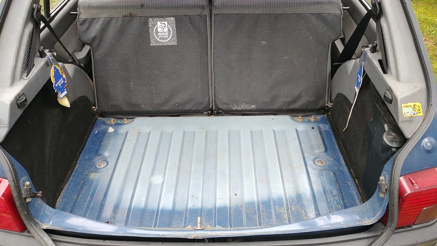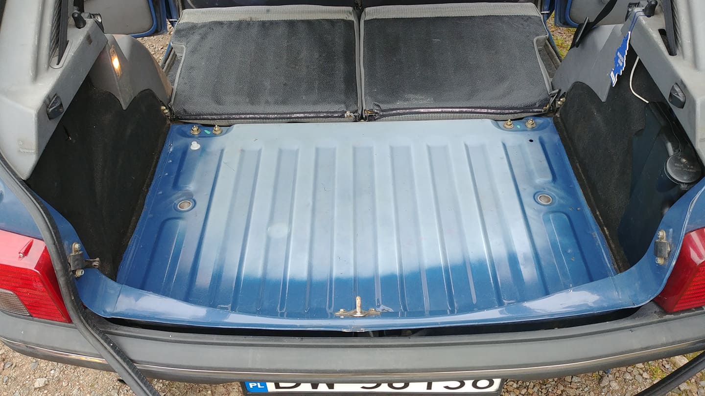 Co ciekawe, pod spodem było jeszcze oryginalne filcowe wygłuszenie bagażnika. Trochę już ubite, trochę pokruszone, ale dało się poodkurzać i umieścić z powrotem.